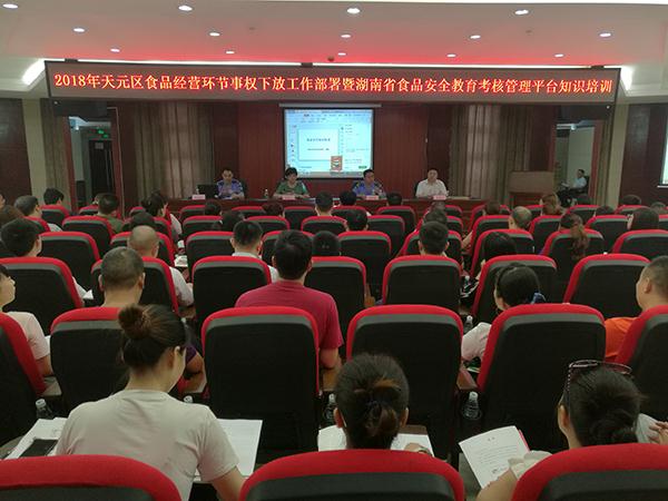 7月10日,日博ribo88天元分局组织开展食品经营环节事权下放工作部署暨湖南省食品安全教育考核管理平台知识培训,辖区大型超市、大型餐饮店、酒类批发企业负责人及相关食品安全管理人员共计150余人参加会议。